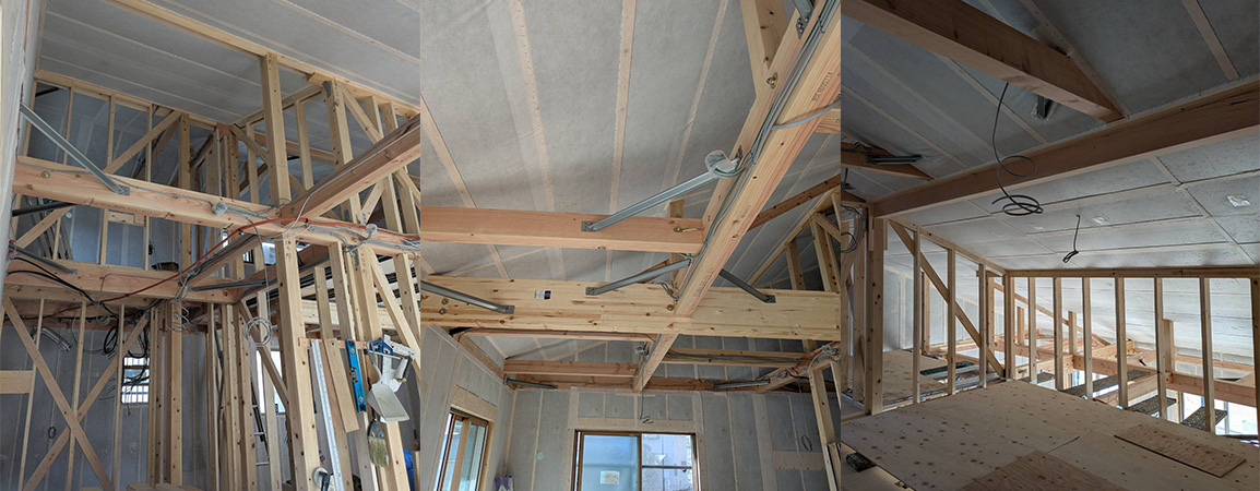 自然素材由来の断熱材であるセルローズファイバーは、高い断熱性・調湿効果を備え、冬は暖かく夏は涼しい快適な室内環境を提供します。